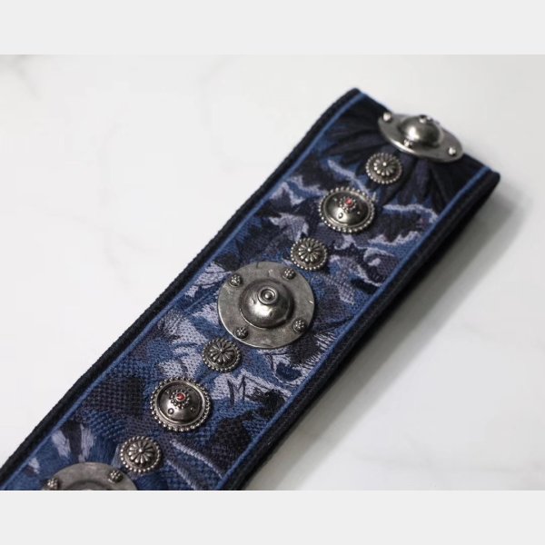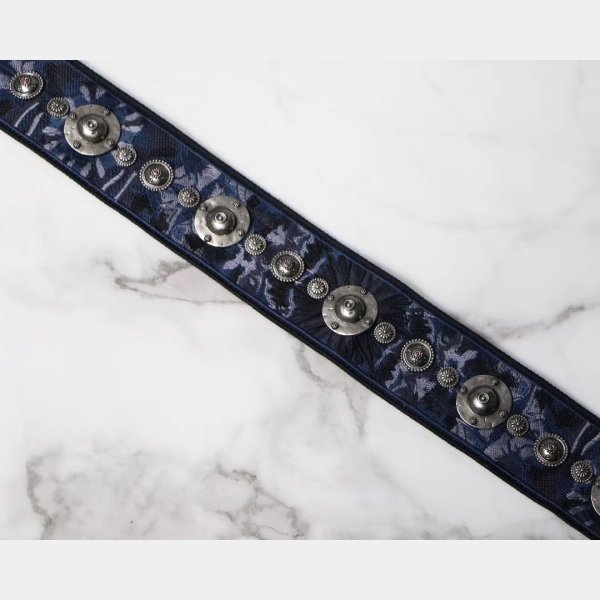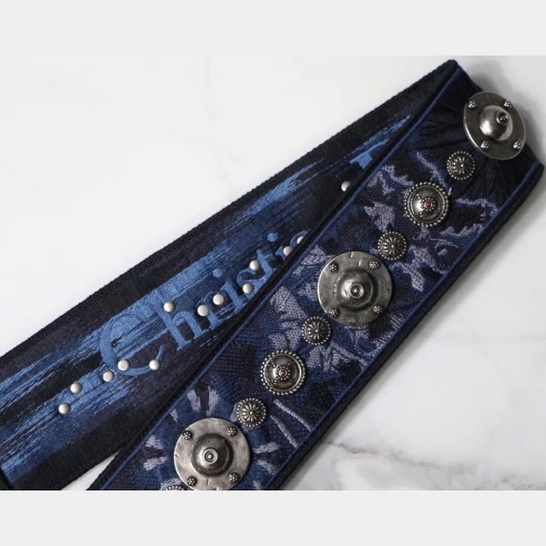 Esta correa elegante está hecha de lienzo que presenta emblemas de metal con tachuelas maravillosamente a través de la superficie y los broches de oro envejecidos. Disfrute de la forma, la función y el estilo de esta correa única para el uso diario, de Christian Dior!