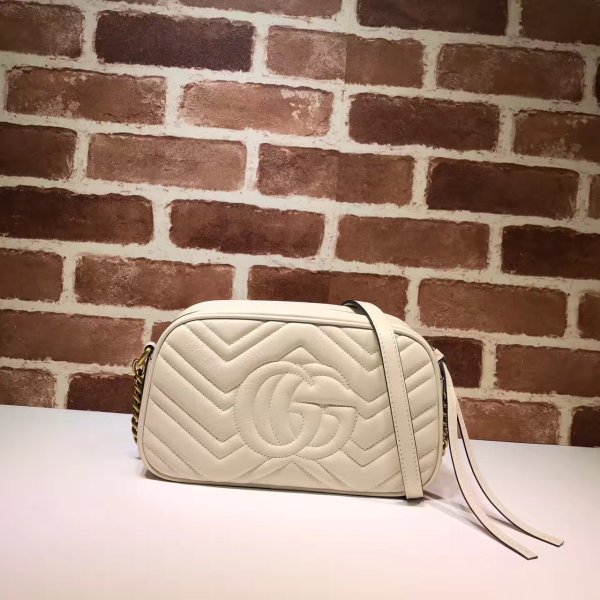 La pequeña réplica de la cadena de la cadena de marmont GG tiene una forma suavemente estructurada y un cierre superior con el cierre con el doble G. La correa para el hombro de la cadena tiene un detalle del hombro de cuero. Hecho en cuero matelassé con un diseño de chevron y GG en la parte posterior.