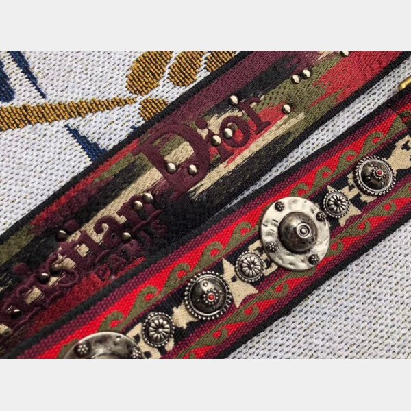 Esta correa elegante está hecha de lienzo que presenta emblemas de metal con tachuelas maravillosamente a través de la superficie y los broches de oro envejecidos. Disfrute de la forma, la función y el estilo de esta correa única para el uso diario, desde Christian Dior!